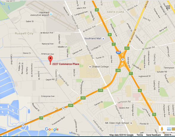 From Sacramento/Concord: Take I-680 South, turn to I-580 west, and to I-880 South. Exit Western Winton Ave, turn right at exit, turn left to Clawiter Rd, and turn right to Commerce Place. We are on right hand side. |